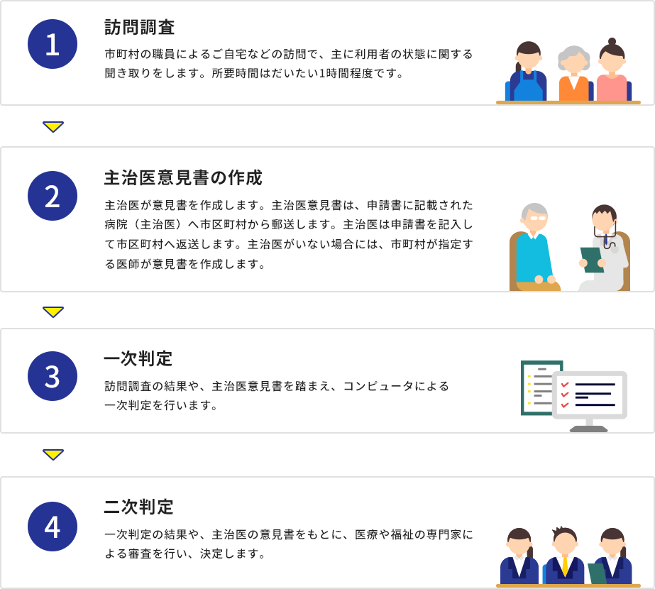 申請をした後、下記のような訪問調査や審査・判定の手順を踏んで、どの程度の介護や支援が必要なのかの目安となる「要介護度」が決まります。