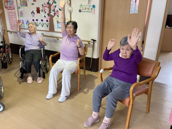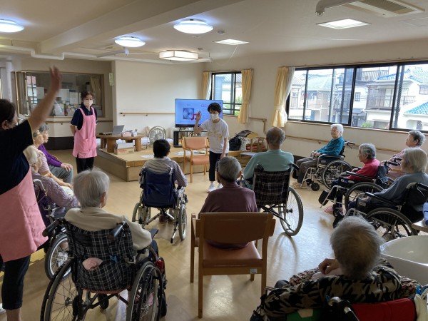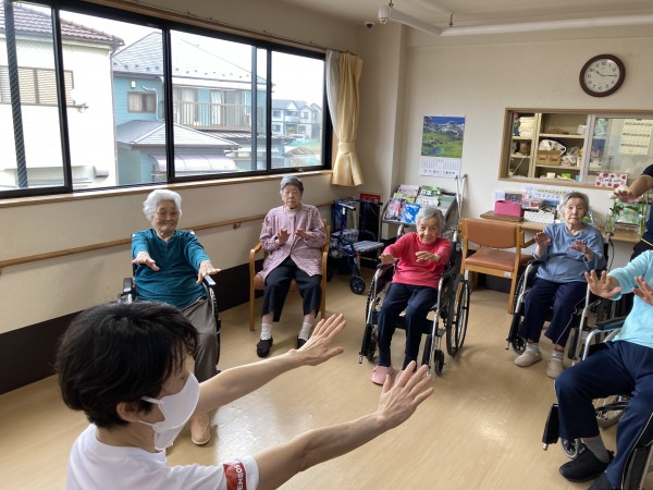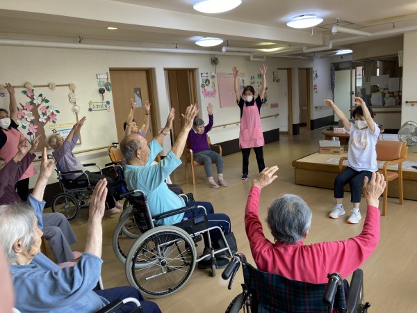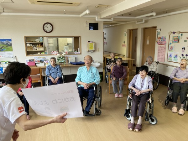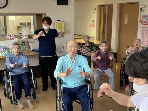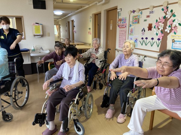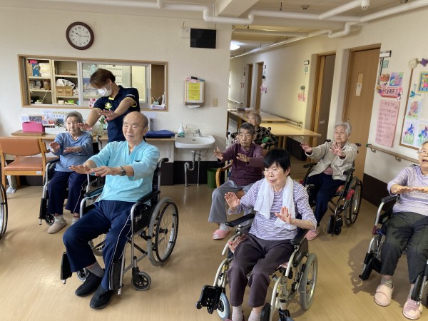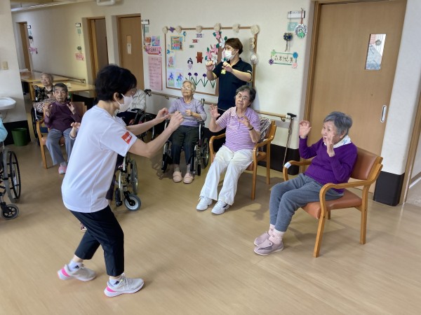 さぁ、本部よりいらっしゃいましたよ~! 体操の岡庭先生!! 先生の体操はちょっぴりハードですが、頑張って楽しく取り組んでいきまSHOW!(^_^)/ 本日は、1階2階合同で行いまーす!