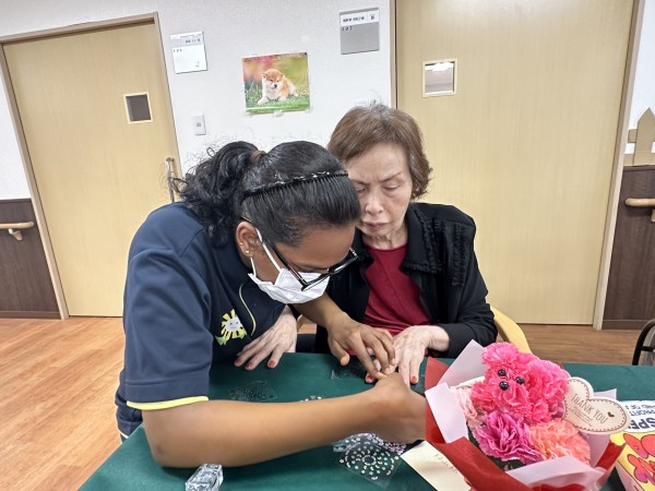 最近、東本郷ではネイルのレクを行うことがありますが、母の日は、更に皆様に綺麗になっていただこうと、ネイルシールをご用意しネイルアートで楽しんでいただくことにしました( `ー´)ノ