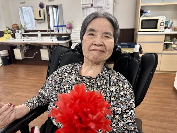 母の日でご利用者様に届きましたお花はご本人様にお届けし、更に皆様にも見ていただけるようお借りし、卓上に飾らせていただきました。