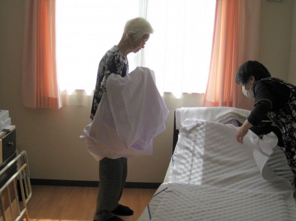 職員と一緒にシーツ交換をされています。「綺麗になると気持ちいいわよね?!」とにっこり(*^_^*)