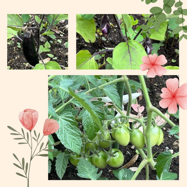 新緑の美しい季節を迎え、アミカの花壇に植えた野菜達がふっくらと可愛い実をつけました。