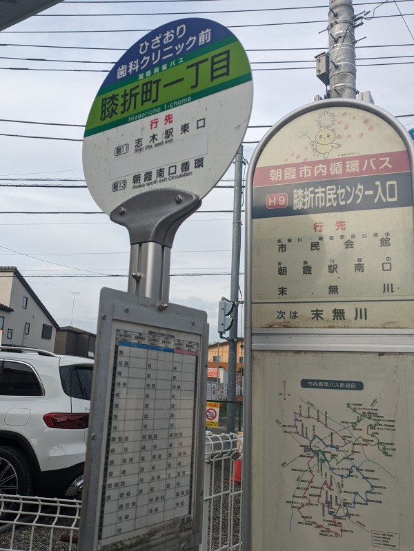 東武東上線・朝霞駅からですと 国際興業バス、朝13 朝霞南口循環で 膝折町1丁目 バス停下車願います。 (1時間に1本ほど。2024年5月現在)