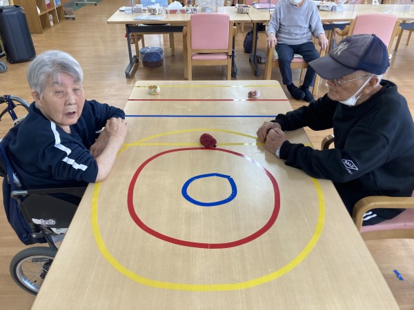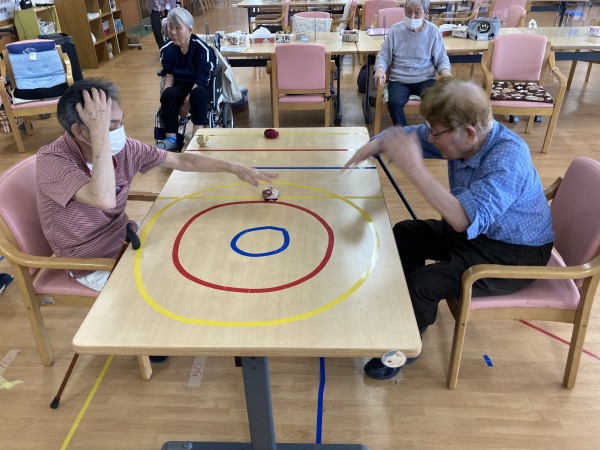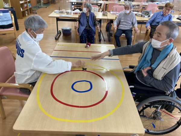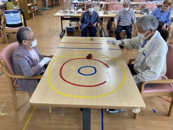 カラオケのイントロが止まった時に、テーブルの上にあるお手玉を取るゲームです。