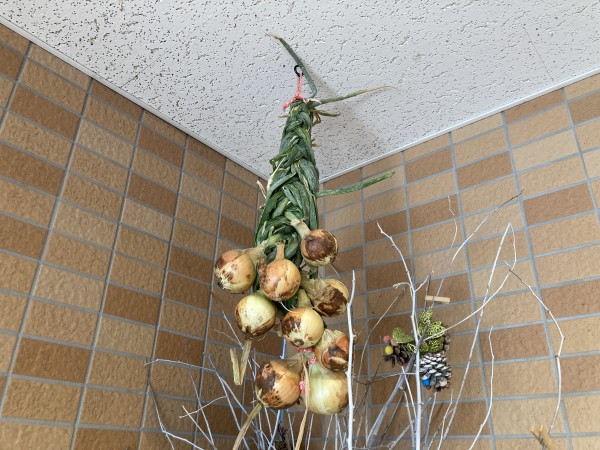 残った玉ねぎは乾かすために葉を編み込んで天井から吊るしておきました!