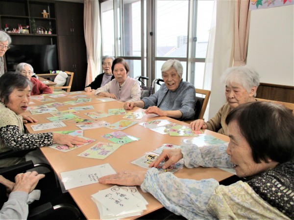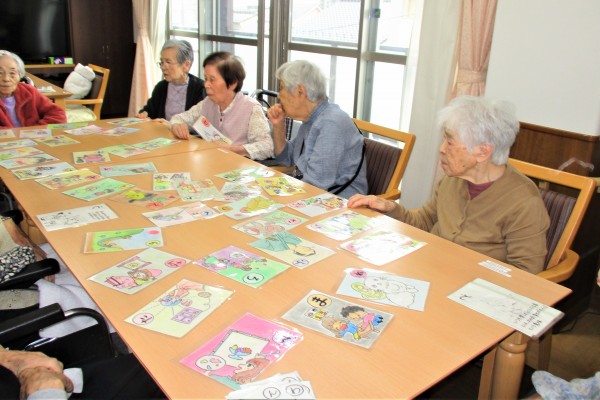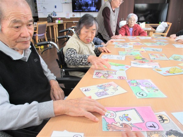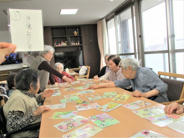 職員さんが作ってくれた大判の絵かるたで、元気に賑やかに過ごしました。