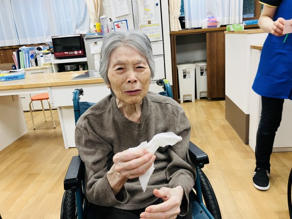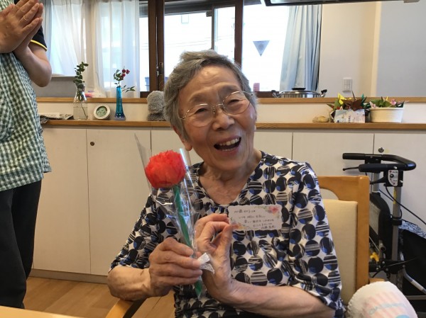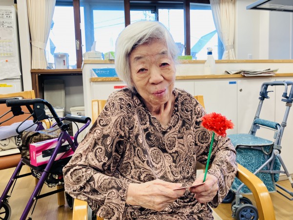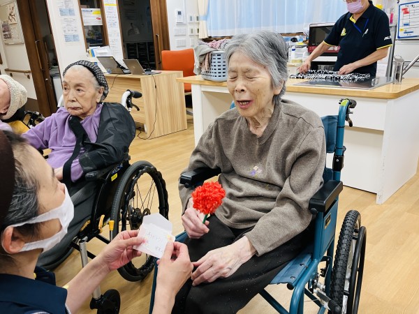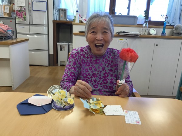 美味しい蒸しパンを食べた後は「母の日」レクです。ホームからは、手作りカーネーションの贈呈。ご家族様からはお手紙を書いて頂きました。ご家族からのお手紙は職員が代読。涙を流される利用者様もいらっしゃいました。
