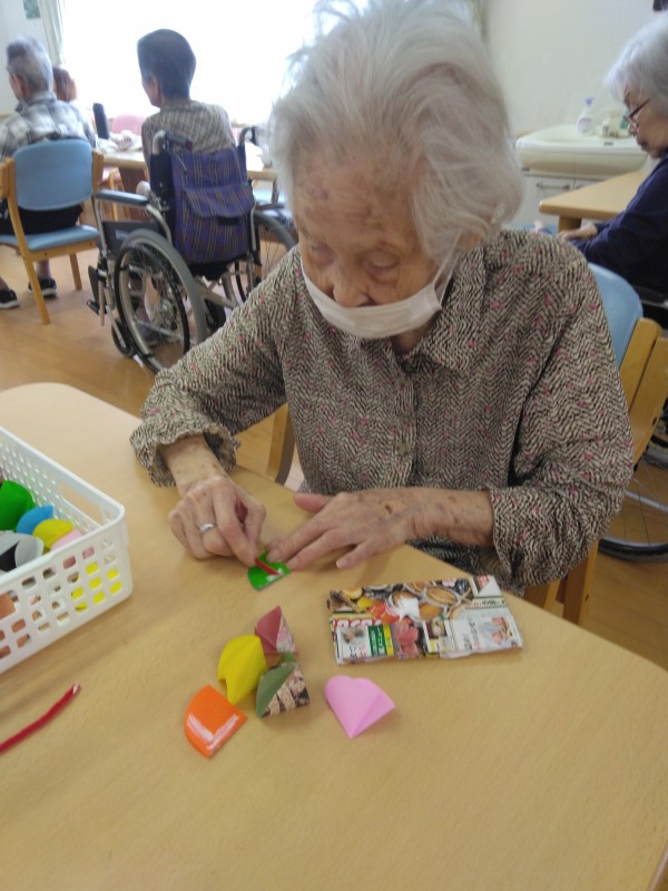 皆様作る前は「難しそうね、私にできるかしら」と不安な様子でしたが作り始めるととっても真剣に作られ「この色の組み合わせはどう?」「ボンド付けるのここよね」「あの人のとっても綺麗ね」と楽しんでいただけた創作レクリエーションでした♪