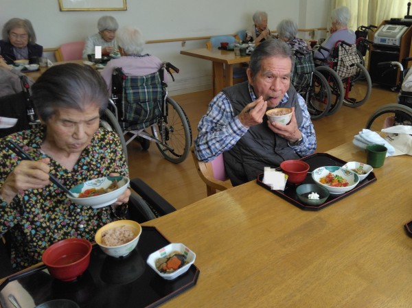 お誕生日メニューはお赤飯・すまし汁・揚げあじの甘酢あんかけ・茄子の煮浸し・巨峰ゼリーと豪華な昼食を召し上がっていただきました!