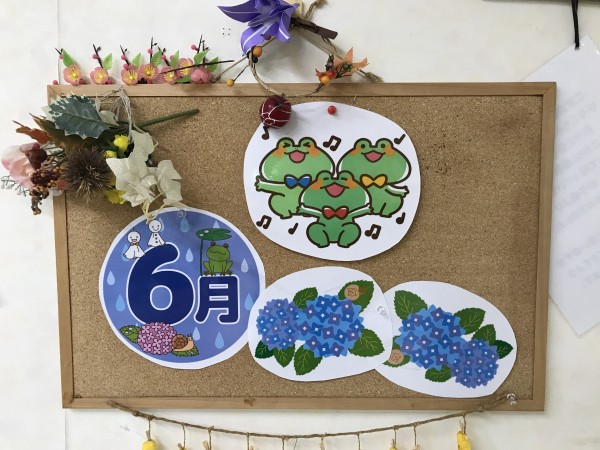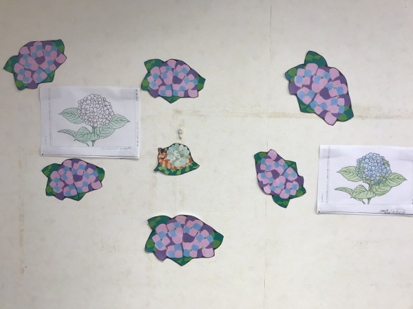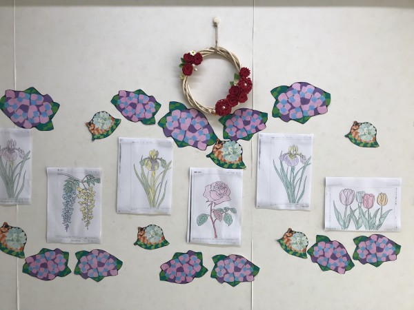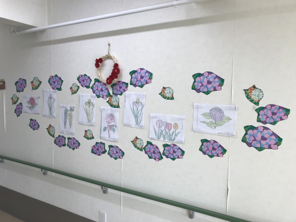 入居者様の塗り絵を飾り付け周りを、紫陽花(お手製)で囲んでみると