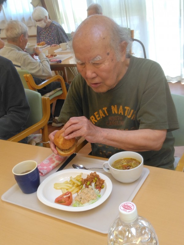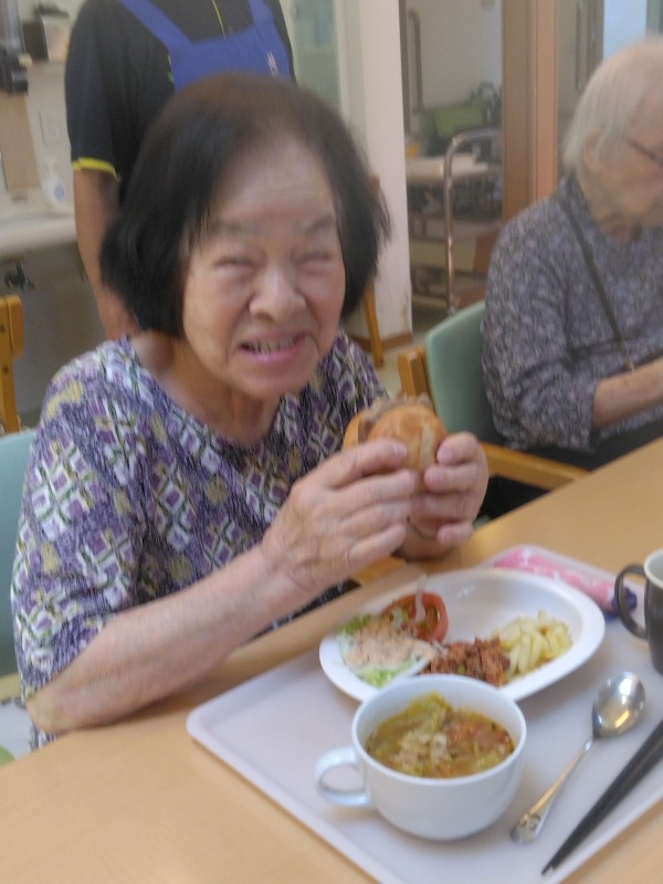 (1枚のバンズを折りたたんで)「この挟み方だと2個食べられる」