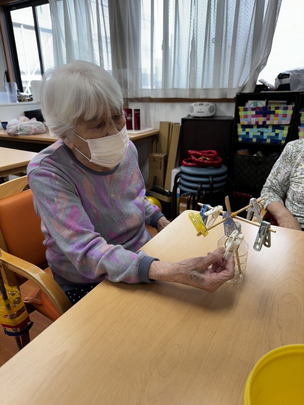 手で支えながら行ってはいけません!洗濯バサミだけで割り箸にはさんで付けていき、倒した人の負けです!