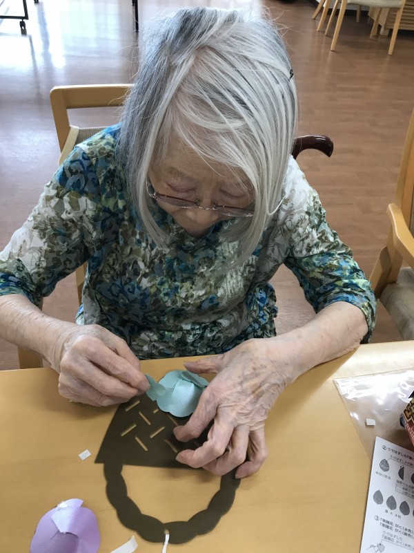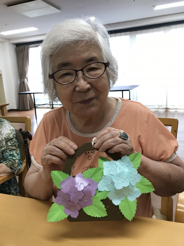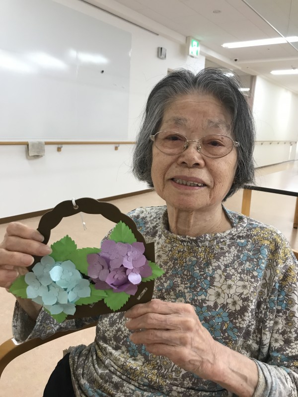 目にも鮮やかなアジサイの飾りつけを利用者のみんなと一緒に作りました。