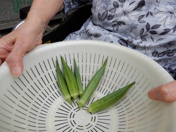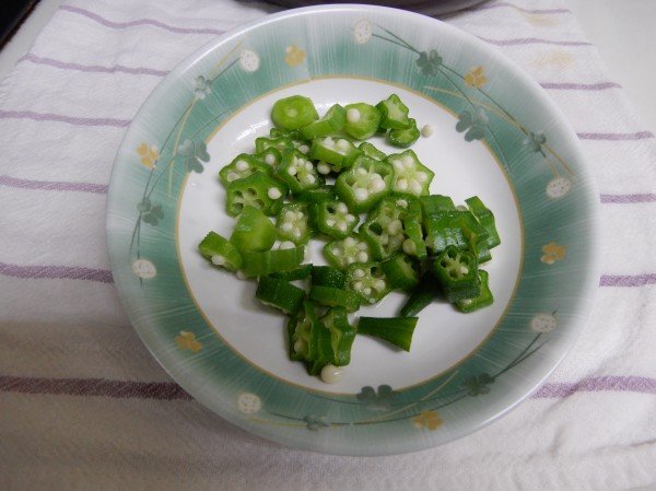 3. ホームで種から育てたオクラが立派に実りました!早速収穫して、うどんの彩として乗せ、頂きました!①