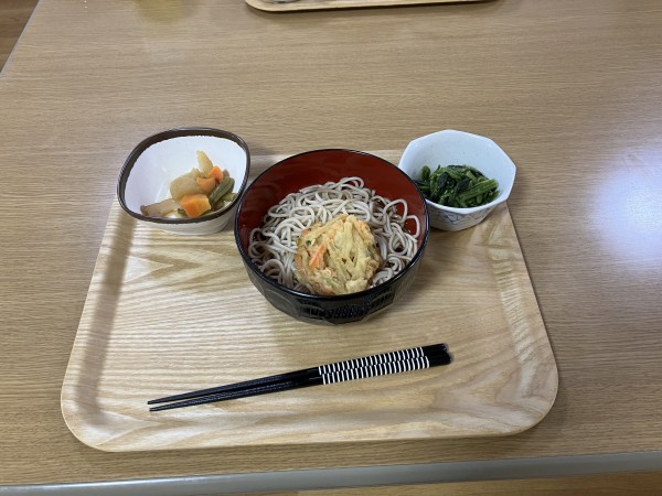 本日の昼食は、「天ぷらそば・ほうれん草のお浸し・煮物」です。