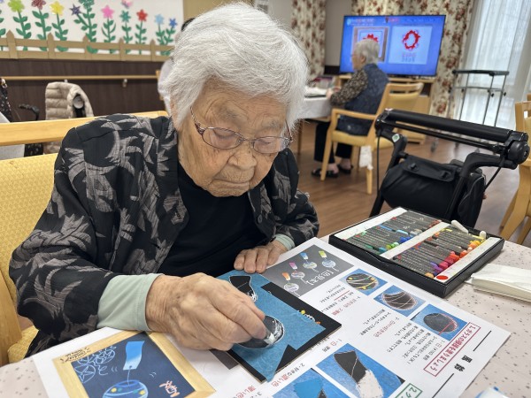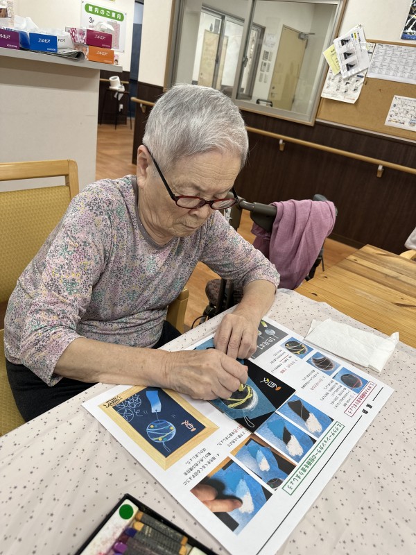 いつもと違うのは、お好きな色を使うということで、何十種類もあるオイルパステルをご利用者様の前に置き、選んでいただいたので、迷っている方や、お好きな色をすぐに手に取る方、見本を一生懸命見て選ぶ方。アドバイスをしながら職員や先生と一緒に選びました☆☆