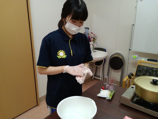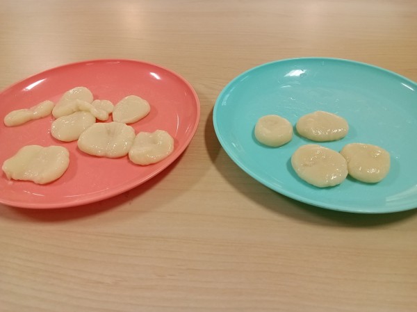 看護師さんや職員さんに試食してもらったところ、白玉粉に対してお豆腐が2.5倍の方がよさそうでした。