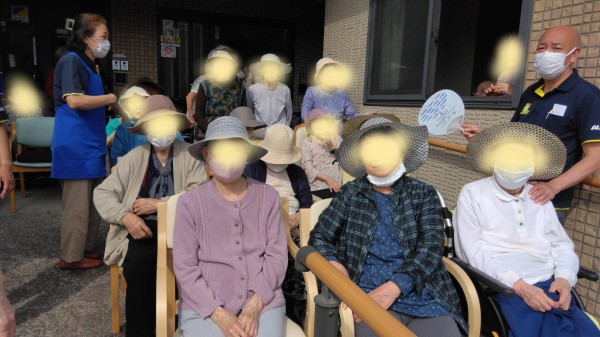 おとなりのグループホームかたくりの里六郷の職員さんから、『今日、よいこの保育園の子たちのお神輿が来るから一緒に見ましょう!!』とお誘いを受けて・・・