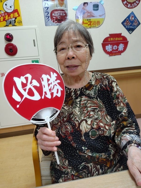 うちわ片手にテレビ中継を見ながら応援をしています。