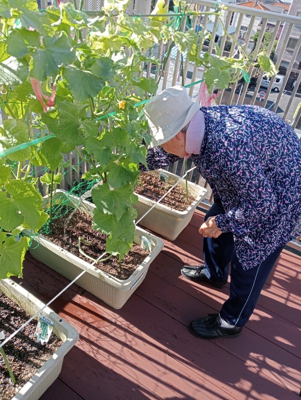 早朝、キュウリの見守りをしてくだる