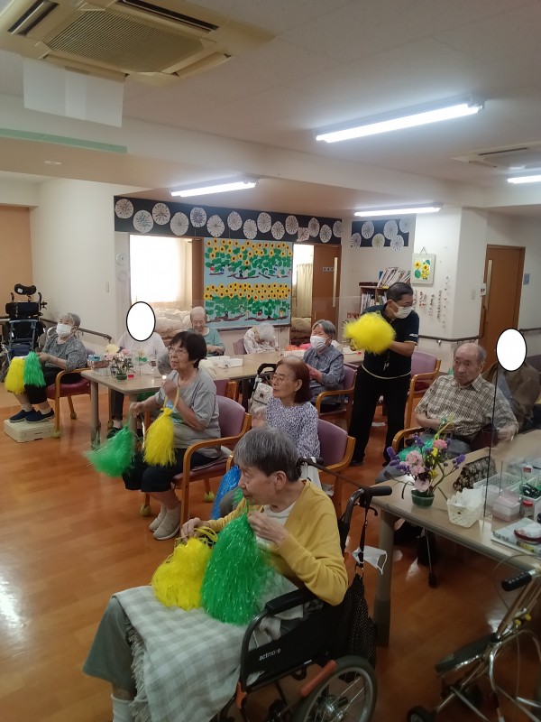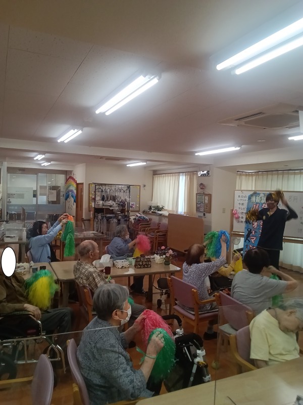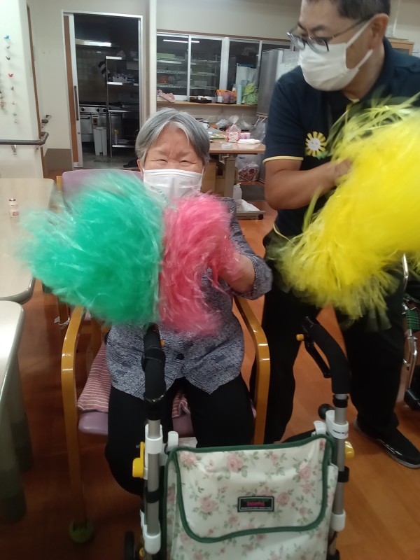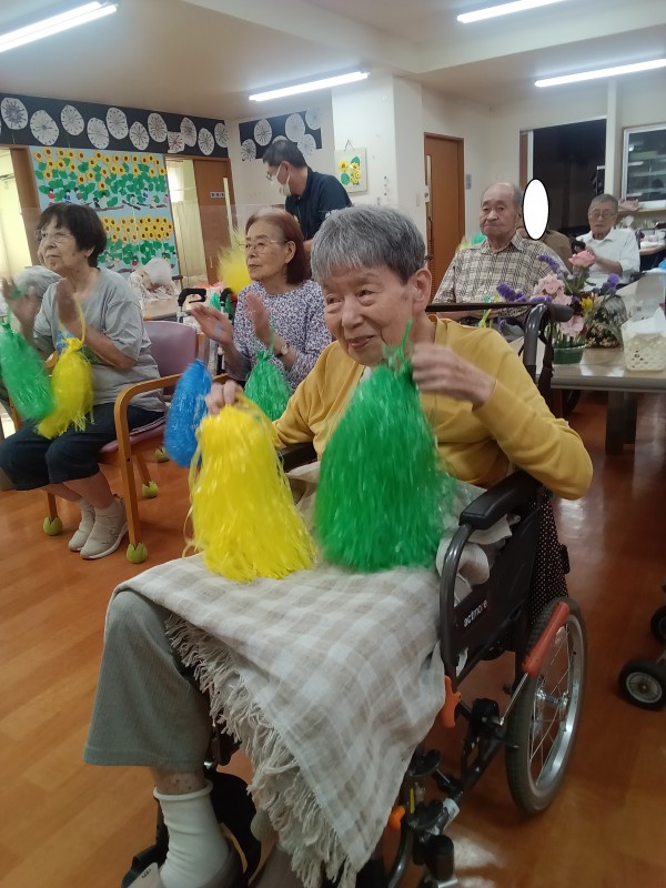 音楽に合わせて、ボンボンを皆で振って、体を動かして盛り上がっていきます。