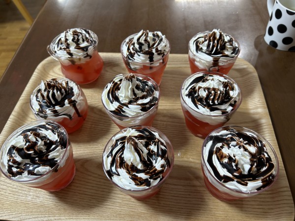 3Fにてフロアレク(苺ゼリーと桃ゼリーのチョコクリームパフェ)を作りました。