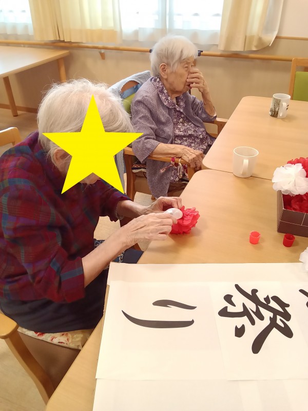 紅白のお花紙を看板に貼ったら完成です!