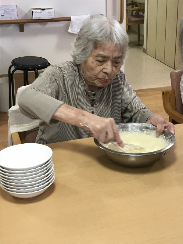 ホームでは、夏生まれの方の合同お誕生日会を開きました♪今回は皆様に手伝って頂きながらホットケーキをたくさん作りました!人数分の生地を混ぜるのは結構力が入ったかもしれませんね!ありがとうございます♪ホットプレートで焼くときれいに仕上がりました!アイスと、ジャムをトッピングして完成です♪「ハッピーバースディトゥーユー」を合唱してから、美味しく召し上がりました。M様、K様、Y様、N様お誕生日おめでとうございます!これからも楽しく笑顔でホームで過ごして下さいね♪