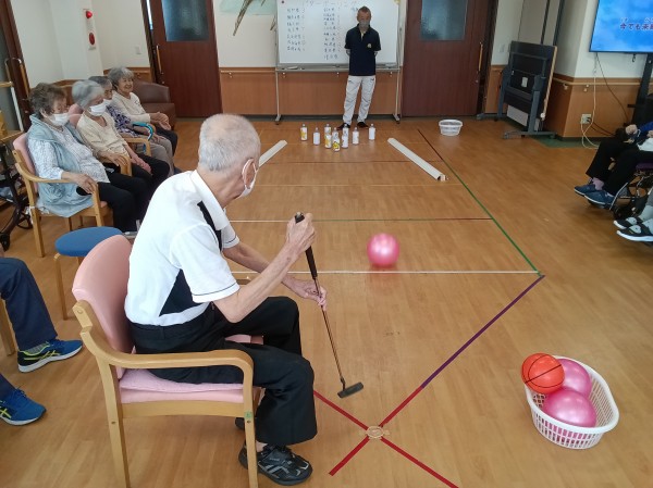 ゴルフのパターで、ボウリングのピンのようなペットボトルを倒すゲームです。