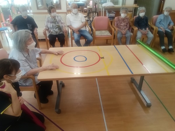 テーブルの上を棒を転がして、どこで止まるかで点数を競うゲームです。