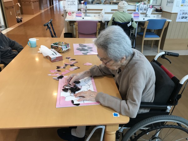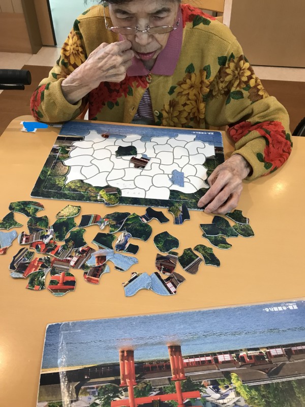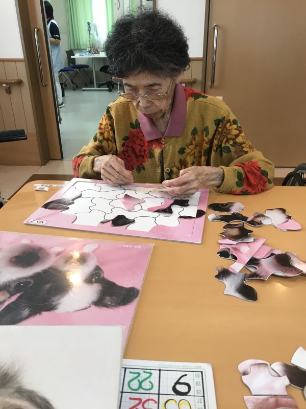 今回は、入居時文字盤で会話・車椅子使用だった方が、シルバーカー歩行・言葉での会話までADLが回復し、さらにパズルを完成させるスピードが激早なご様子をご覧いただきたいと思います。