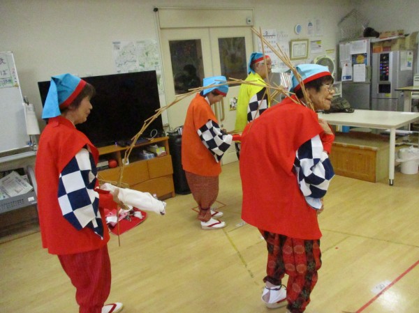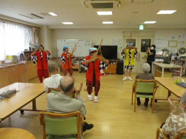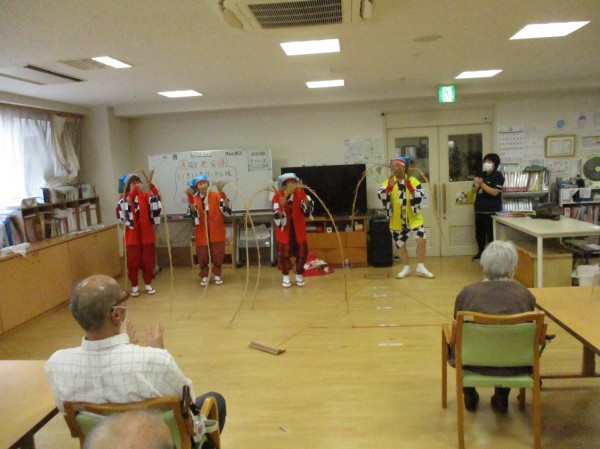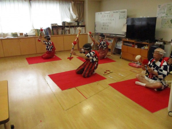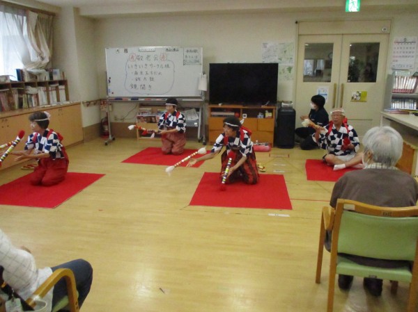 本日は『いきいきサークル 玉すだれ』の方たちに、敬老会第1弾として       おめでたいイベント『南京玉すだれと銭太鼓』を催して頂きました!!!