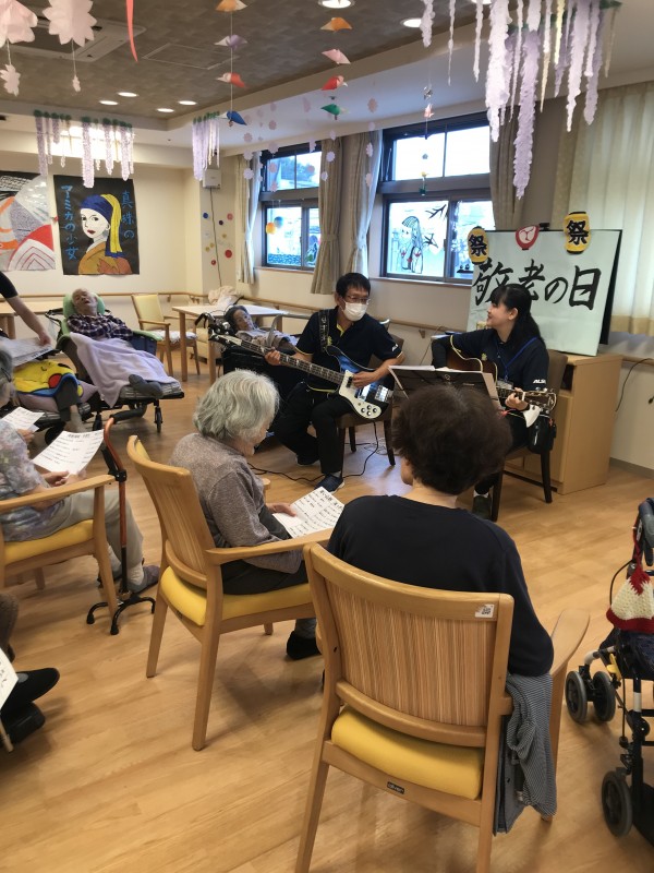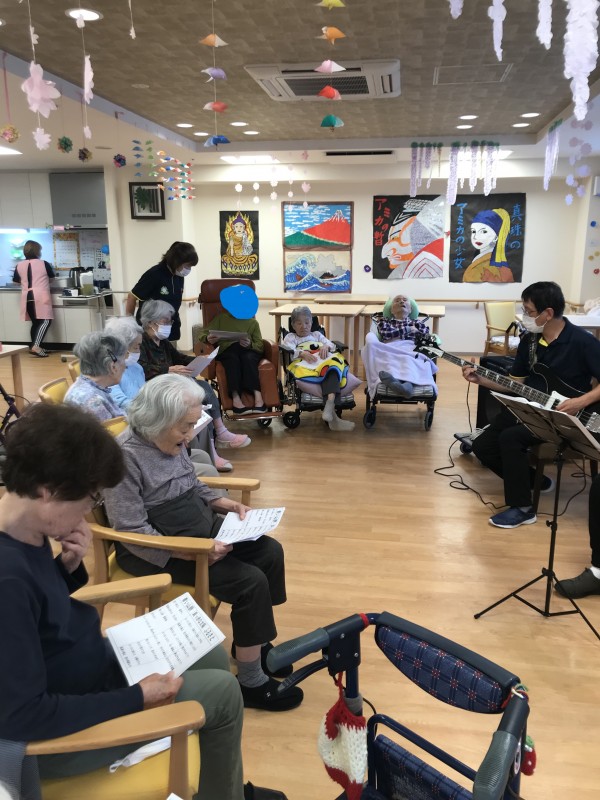 ギターとベースの音色に合わせて「上を向いて歩こう」「青い山脈」「真っ赤な太陽」「ふるさと」をみんなで歌い