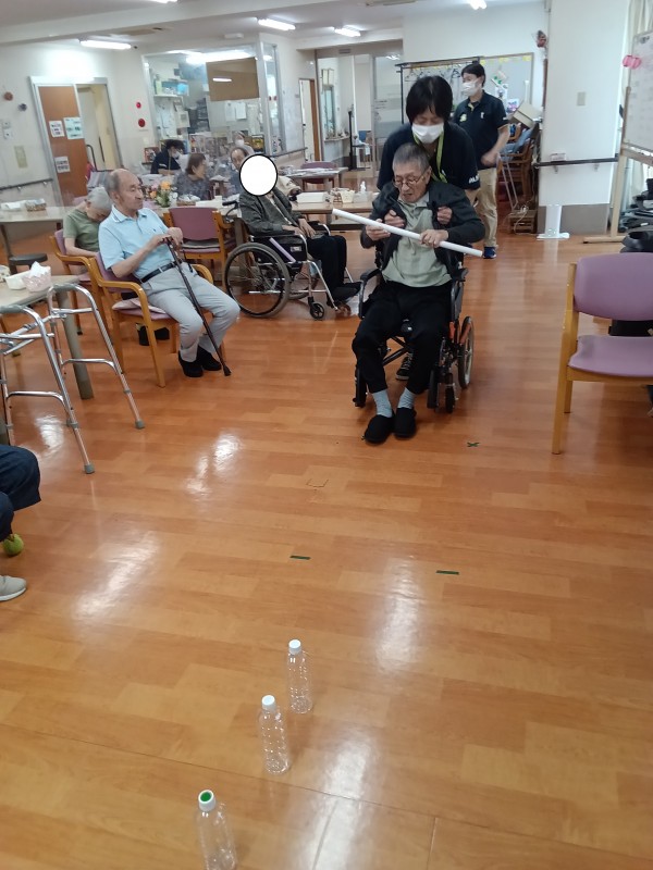 ペットボトルを縦に並べて、持っている棒を転がして何本倒れるかで勝敗決めています。