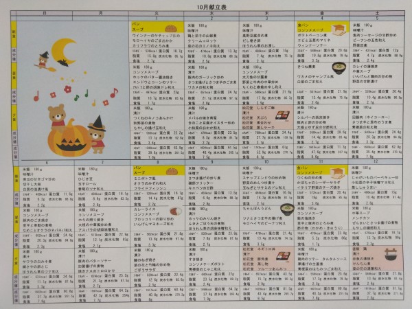 10月のメニュー表になります。