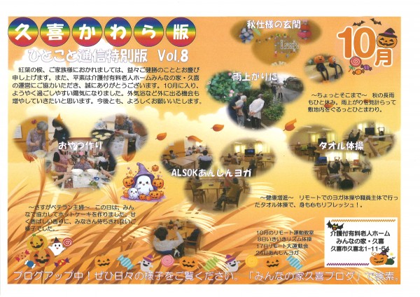 「運動」の秋。「食欲」の秋。と様々ありますが、ここ「みんなの家・久喜」でも、食事が美味しく召し上がられるように、適度な運動はもちろん、健康管理に十分に注意を図りながら、秋と言うシーズンを満喫したいと思います。