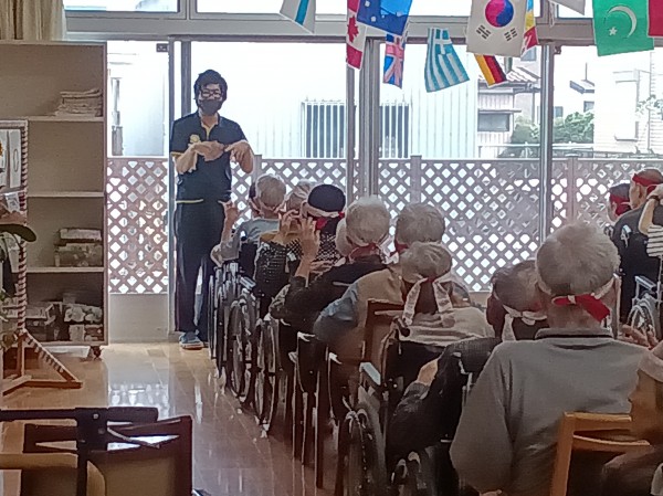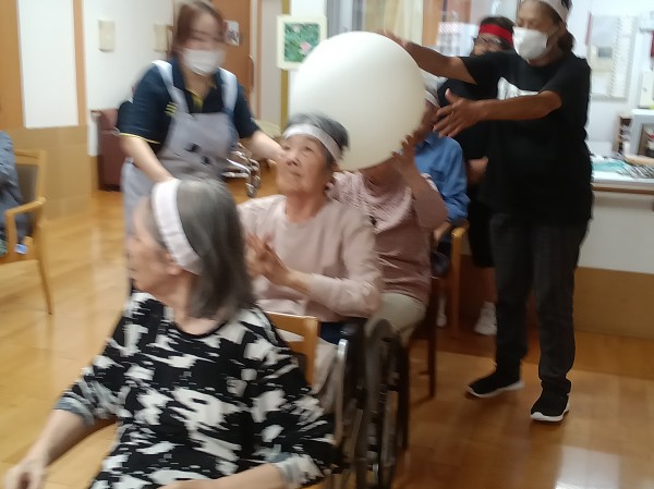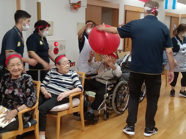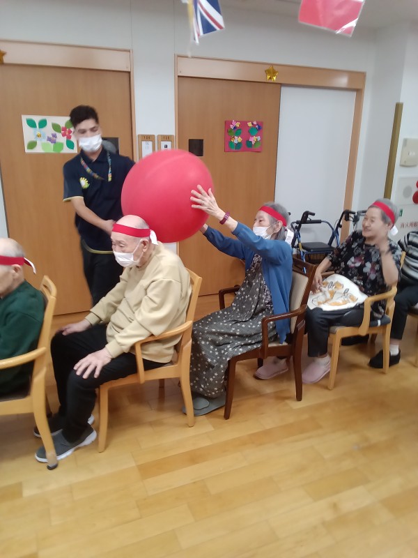 今年のプログラムは『大玉送り』『スプーンリレー』『玉入れ』、職員競技で『キャタピラリレー』でした。