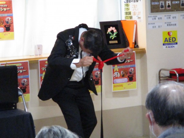 次は紐を使った手品!紐を輪っかに通し・・・。お洒落なハンカチが出てきました???
