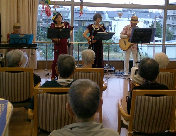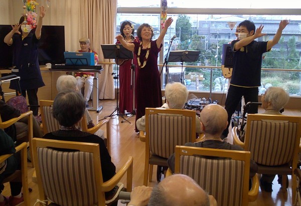 ハワイアンな踊りで職員と入居者様も