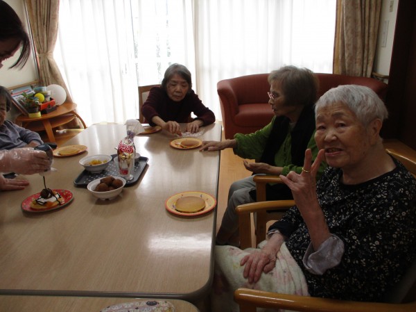 今回のデザートは、ホットケーキの上に生クリームやフルーツ、チョコソースなどのトッピングを皆様にしていただきました(*^▽^*)