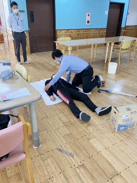 まず、最初に「火災・災害発生時の高齢者の避難対応」の競技の練習をしている様子の写真です。今回の競技は、地震が発生して避難しようとしたもののベットの横で転倒してしまい自力で避難することが難しく、ALSOKを呼んで一緒に安全に避難誘導をするという競技です。