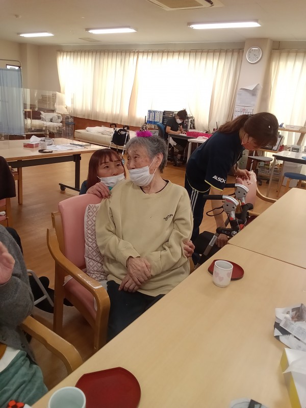 職員が利用者様にシールをペタペタと貼ったり、お菓子を配りました。