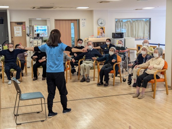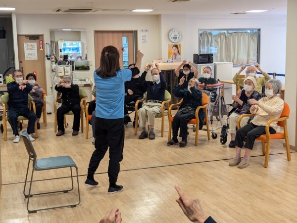 訪問運動教室は、毎月1回 先生が訪問し1階リビングで体操をおこなっています。