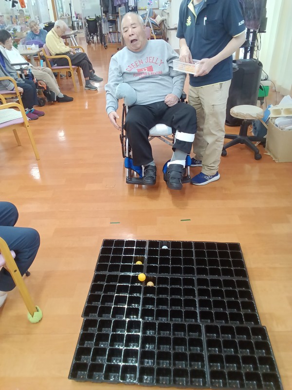 1人10球ピンポンを奥の黒い枠に入れていきます。