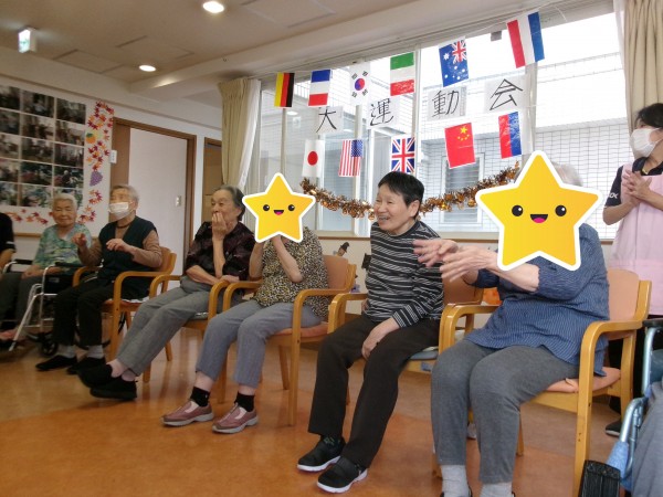 風船バレー・紅白玉入れ・赤青旗揚げを行いました。