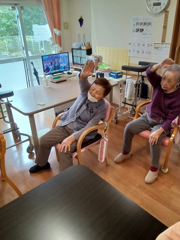 今月も運動教室の先生を招いての体操の日だったので様子をお伝えしていきます。今月は移動が難しい入居者様もいらっしゃったので1Fと2Fに分かれて実施させていただきました