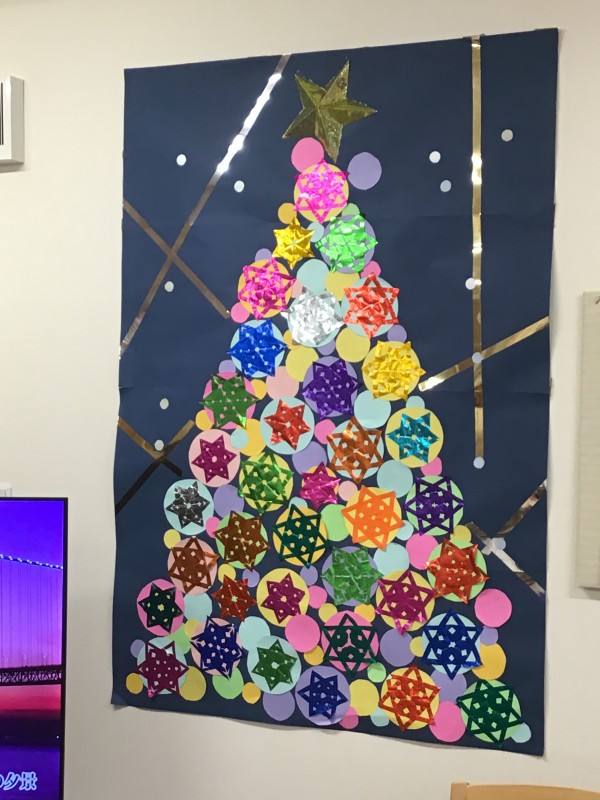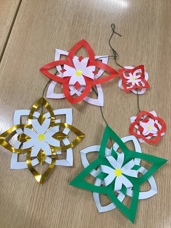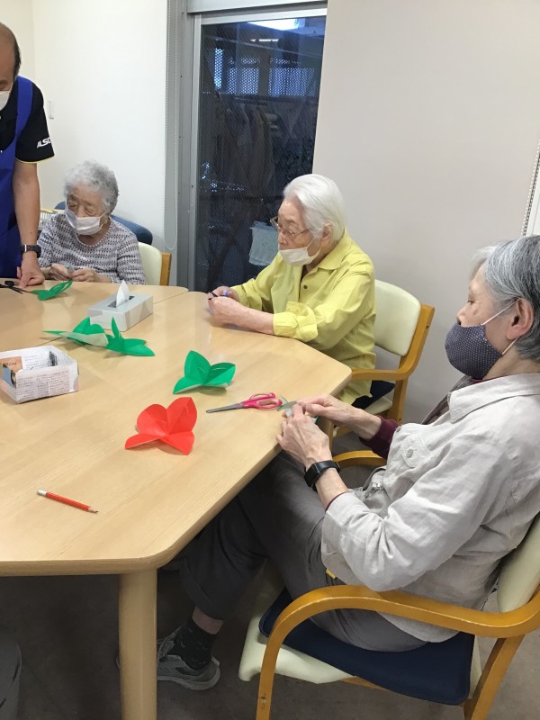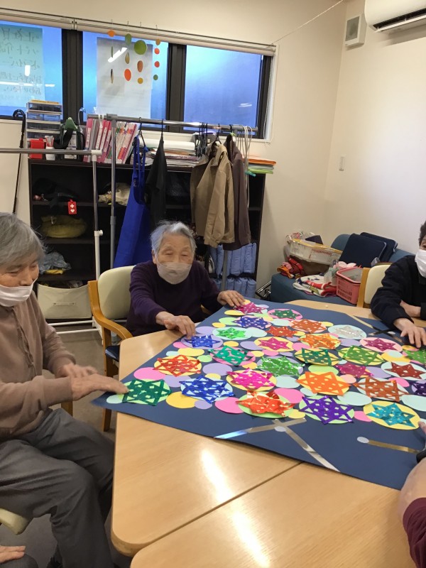 まずは折り紙で作った切り絵を色画用紙に貼り付け