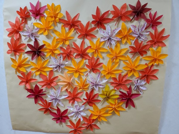 季節の花等のちぎり絵や装飾をメインに作成活動している私達。(利用者様とケアスタッフの共作です。)