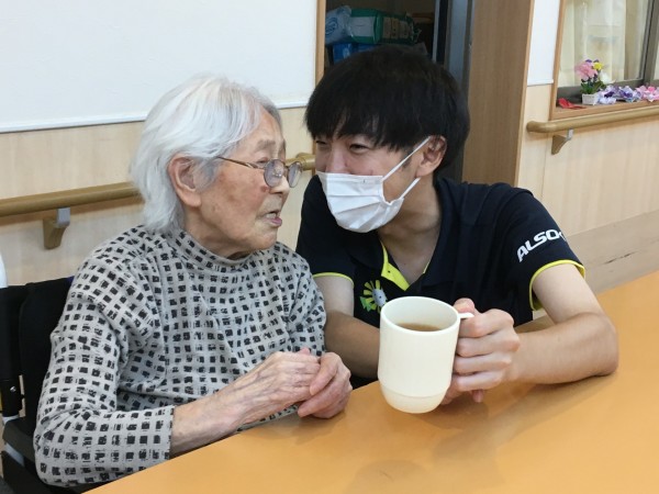 K様に水分補給の声かけをします。