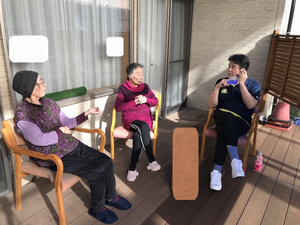 お天気が良かったので、外のテラスで談話をされる3人(^^)/